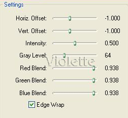7 - Activer l’image landsch2.jpg Calques/Charger/Enregistrer à partir du disque /Charger à partir /choisir le masque 20/20 /Calques/Supprimer/Calques /Fusionner le groupe Edition/copier /Edition/Coller comme nouveau calque le placer vers la gauche Opacité à 30% Effets/FM Tile Tools /Blend Emboss