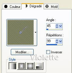 faire une seconde fois 8 - Activer le tube mds3509Fantaisy/ Edition/copier /Edition/Coller comme nouveau calque le placer vers la droite Opacité à 35% Effets/FM Tile Tools /Blend Emboss 9 - Activer le tube des chevaux/ Edition/copier /Edition/Coller comme nouveau calque le placer vers la droite Opacité à 40% 10 - Calques/Nouveau calque Remplir de dégradé linéaire angle 45° répétitions : 99