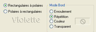Effets/ FM Tile Tools / Blend Emboss par défaut ou une ombre portée : 1/1/100/16/noir 5 - Dupliquer/Image/Miroir 6 - Se placer sur le calque inférieur Effets / Effets de distorsion/Coordonnées polaires :