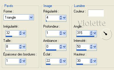 7 - Placer les hémisphères comme sur le modèle 8 - Ouvrir le tube Marif / Edition/copier /Edition/Coller comme nouveau calque Faire le même ombre portée qu'au n° 4 9 - Image /Ajouter des bordures : 2 pixels couleur foncée de l’image 10 - Image /Ajouter des bordures : 2 pixels couleur claire de l’image 11 - Image /Ajouter des bordures : 2 pixels couleur foncée de l’image 12 - Image /Ajouter des bordures : 30 pixels couleur claire de l’image sélectionner avec la baguette magique 13 - Effets/Effets de texture / Mosaïque/Triangle :