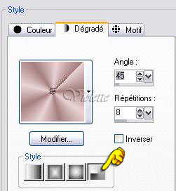 *** 1 - Ouvrir les tubes/ les images, les dupliquer et fermer les originaux 2 - Activer l'image chrismist_lace_template1.psp prélever deux couleurs Placer en avant-plan la couleur #e8d3d3 et en arrière-plan la couleur #a67f7f Configurer un dégradé linéaire radial: 45°/ répétition: 8 / inverser non coché