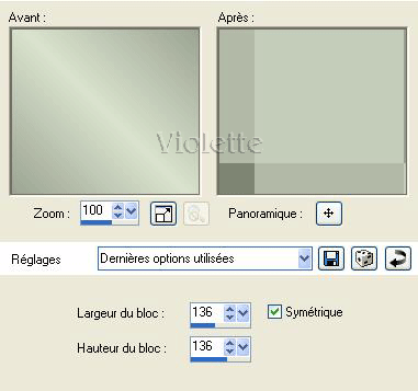 1 - Ouvrir les tubes/ les images, les dupliquer et fermer les originaux 2 – Ouvrir une image transparente de 650 x 450 pixels 3 – Placer la couleur #060902 en avant-plan et la couleur #d9e3cd en arrière-plan 4 – Configurer un dégradé linéaire angle : 45° répétition : 1 5 – Remplir l’image 6 - Effets /Effets de distorsion/Pixellisation :