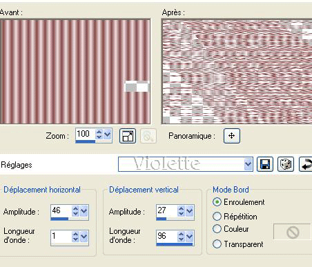 5 - Calques/Nouveau calque 6 - Sélection/Charger/Enregistrer à partir du disque /Charger à partir du disque choisir la sélection sax-fantaisie 7 – Choisir une couleur claire en avant-plan ( ici #f2dedf ) et configurer un dégradé linéaire angle 90° répétition : 90° remplir votre sélection Désélectionner 8 – Effets /Effets de Distorsion /Vagues